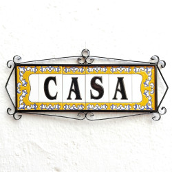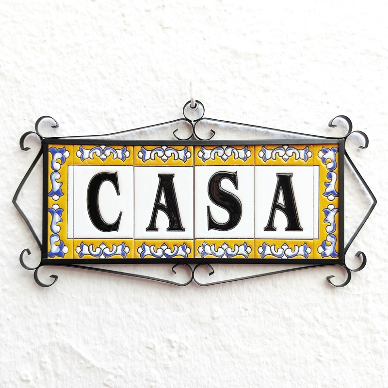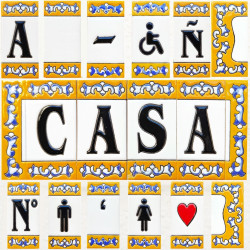 Letreros con números y letras en azulejo de cerámica policromada, pintados a mano en técnica cuerda seca para placas con nombres, direcciones y señalética. Texto personalizable.