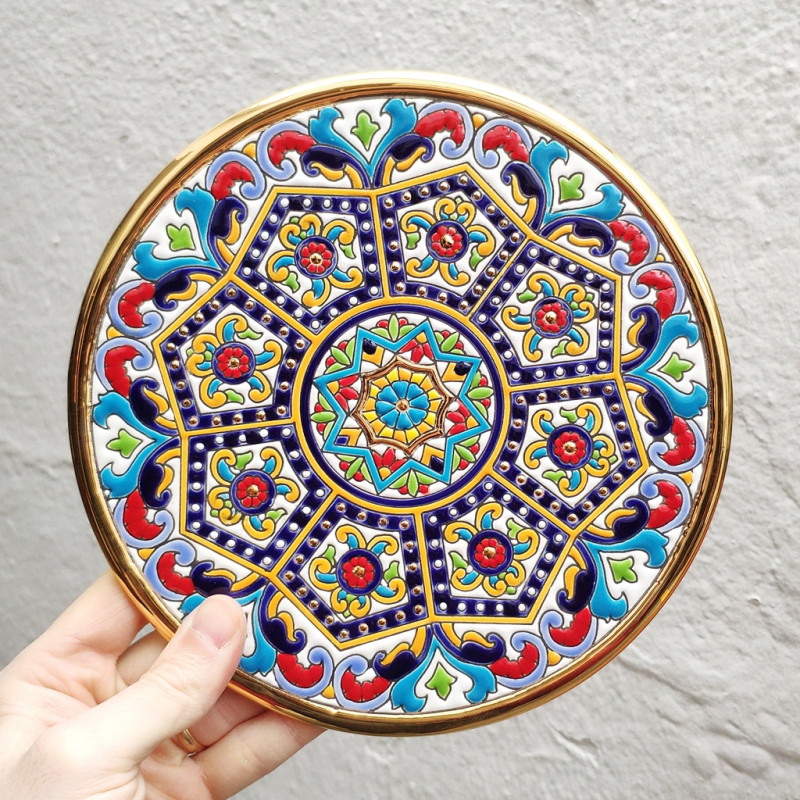 "Artecer" est le plus prestigieux des fabricants de ces assiettes en céramique de Séville. Ces assiettes sont émaillées à l'or 24 carats. Il est connu comme le travail de la "corde sèche", qui a été apporté par les Arabes au 8ème siècle en Andalousie. Depuis lors, ce savoir-faire a été réalisé en Espagne.