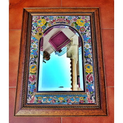 Espejo de cerámica con marco de madera.