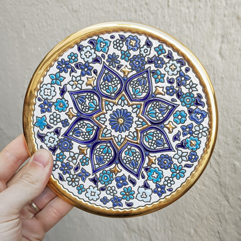"Artecer" es el más prestigioso de los fabricantes de estos platos de cerámica Sevillanos. Estos platos están esmaltados con oro de 24 quilates. Es conocido como el trabajo de “cuerda seca”, que fue traído por los árabes en el siglo VIII a Andalucía. Desde entonces este trabajo artesanal se ha realizado en España.