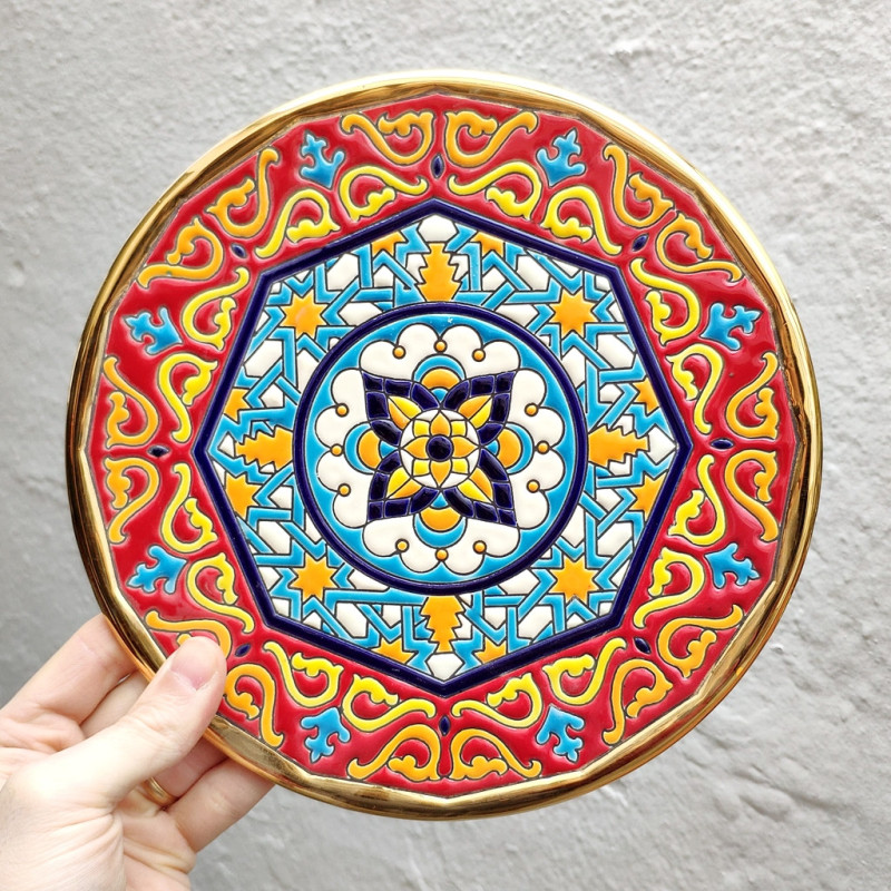 "Artecer" es el más prestigioso de los fabricantes de estos platos de cerámica Sevillanos. Estos platos están esmaltados con oro de 24 quilates. Es conocido como el trabajo de “cuerda seca”, que fue traído por los árabes en el siglo VIII a Andalucía. Desde entonces este trabajo artesanal se ha realizado en España.