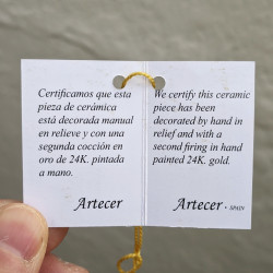 Certificamos que esta pieza pintada en cuerda seca está realizada a mano y acabada en oro de 24Kl.