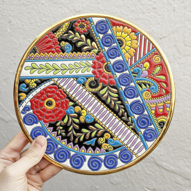 Certificamos que esta pieza pintada en cuerda seca está realizada a mano y acabada en oro de 24Kl.