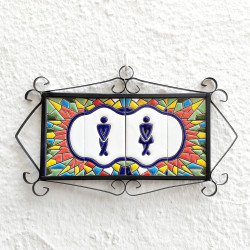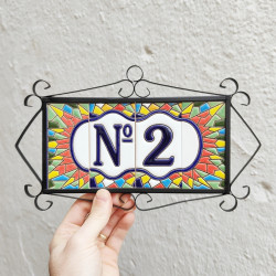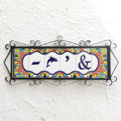Letreros con números y letras en azulejo de cerámica policromada, pintados a mano en técnica cuerda seca para placas con nombres, direcciones y señalética. Texto personalizable.