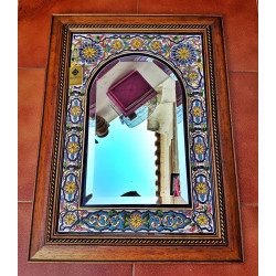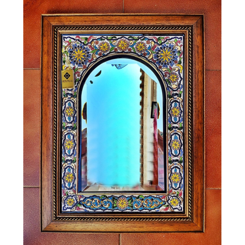 Miroir en céramique avec cadre en bois.