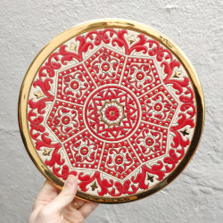 "Artecer" est le plus prestigieux des fabricants de ces assiettes en céramique de Séville. Ces assiettes sont émaillées à l'or 24 carats. Il est connu comme le travail de la "corde sèche", qui a été apporté par les Arabes au 8ème siècle en Andalousie. Depuis lors, ce savoir-faire a été réalisé en Espagne.