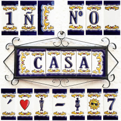 Enseignes avec chiffres et lettres en céramique polychrome, peintes à la main en technique corde sèche pour assiettes avec noms, adresses et signalétique. Texte personnalisable.
