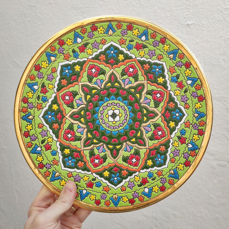 "Artecer" est le plus prestigieux des fabricants de ces assiettes en céramique de Séville. Ces assiettes sont émaillées à l'or 24 carats. Il est connu comme le travail de la "corde sèche", qui a été apporté par les Arabes au 8ème siècle en Andalousie. Depuis lors, ce savoir-faire a été réalisé en Espagne.