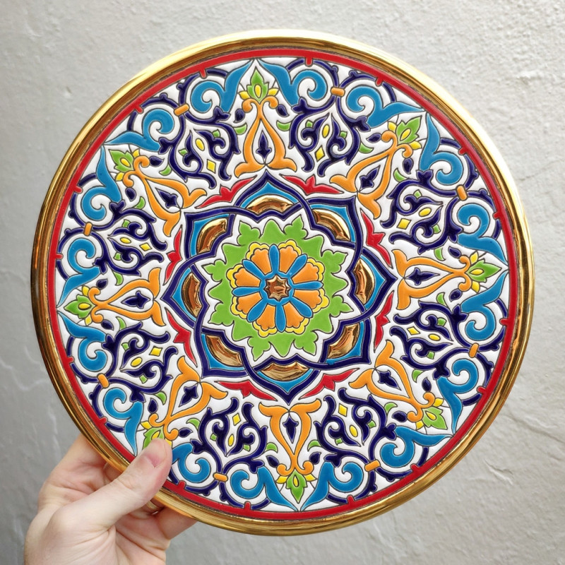 "Artecer" est le plus prestigieux des fabricants de ces assiettes en céramique de Séville. Ces assiettes sont émaillées à l'or 24 carats. Il est connu comme le travail de la "corde sèche", qui a été apporté par les Arabes au 8ème siècle en Andalousie. Depuis lors, ce savoir-faire a été réalisé en Espagne.