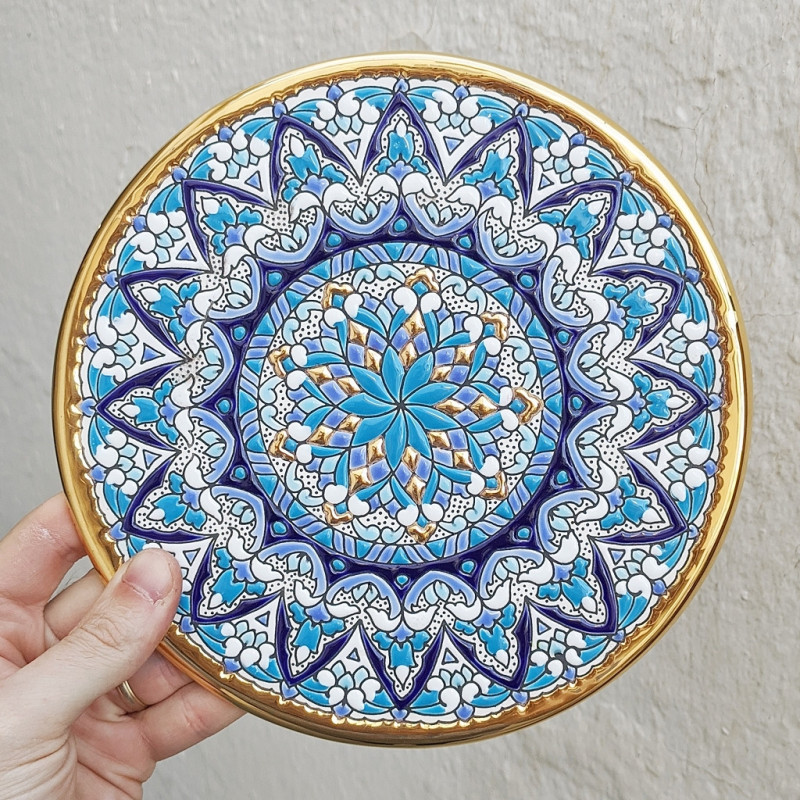 "Artecer" est le plus prestigieux des fabricants de ces assiettes en céramique de Séville. Ces assiettes sont émaillées à l'or 24 carats. Il est connu comme le travail de la "corde sèche", qui a été apporté par les Arabes au 8ème siècle en Andalousie. Depuis lors, ce savoir-faire a été réalisé en Espagne.