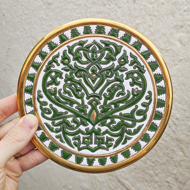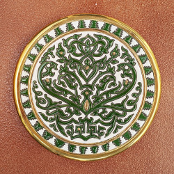 "Artecer" est le plus prestigieux des fabricants de ces assiettes en céramique de Séville. Ces assiettes sont émaillées à l'or 24 carats. Il est connu comme le travail de la "corde sèche", qui a été apporté par les Arabes au 8ème siècle en Andalousie. Depuis lors, ce savoir-faire a été réalisé en Espagne.