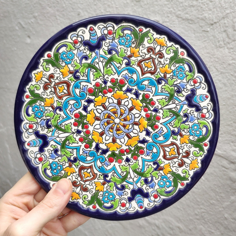 "Artecer" est le plus prestigieux des fabricants de ces assiettes en céramique de Séville. Ces assiettes sont émaillées à l'or 24 carats. Il est connu comme le travail de la "corde sèche", qui a été apporté par les Arabes au 8ème siècle en Andalousie. Depuis lors, ce savoir-faire a été réalisé en Espagne.