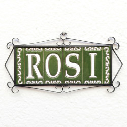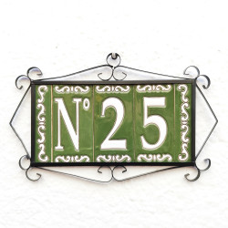 Panneaux avec chiffres et lettres en céramique polychrome, peints à la main en technique corde sèche pour plaques avec noms, directions et signalisation. Texte personnalisable.