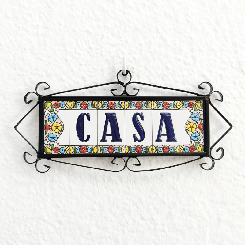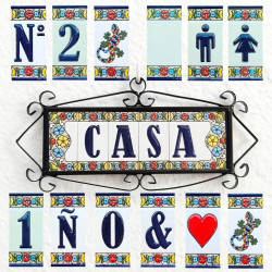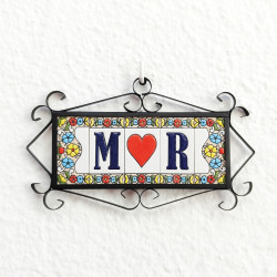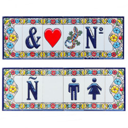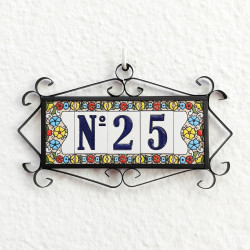 Panneaux avec chiffres et lettres en céramique polychrome, peints à la main en technique corde sèche pour plaques avec noms, directions et signalisation. Texte personnalisable.