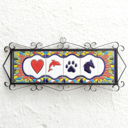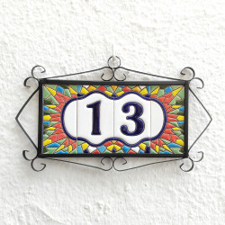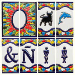 Panneaux avec chiffres et lettres en céramique polychrome, peints à la main en technique corde sèche pour plaques avec noms, directions et signalisation. Texte personnalisable.