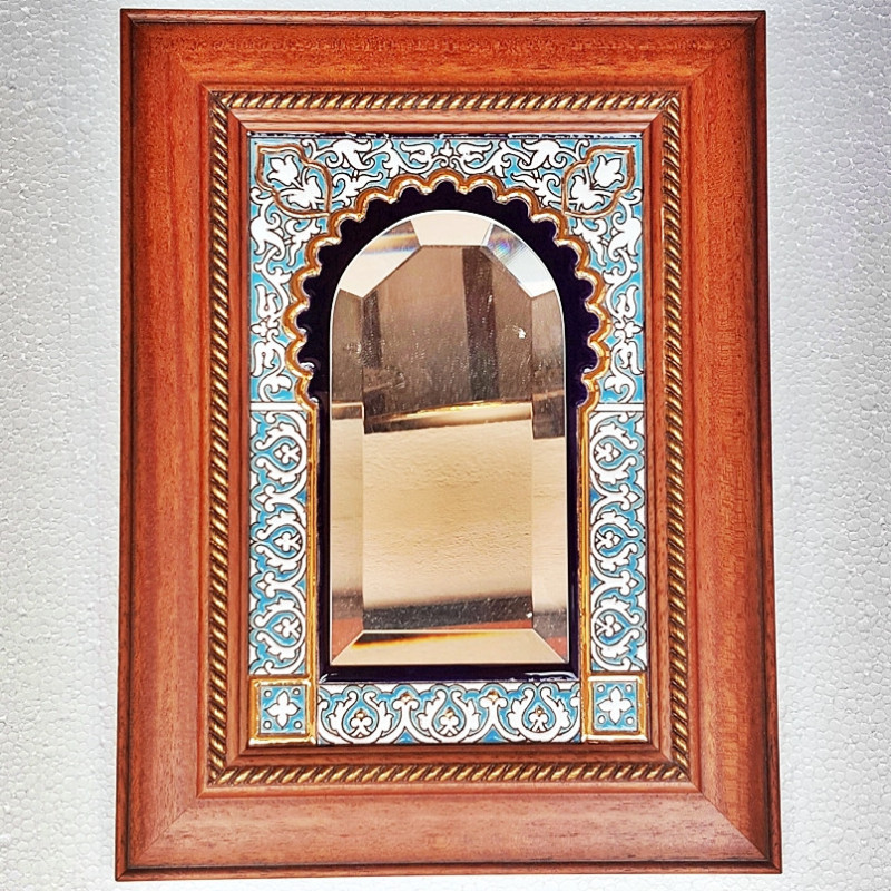 Ceramic mirror with wooden frame.
