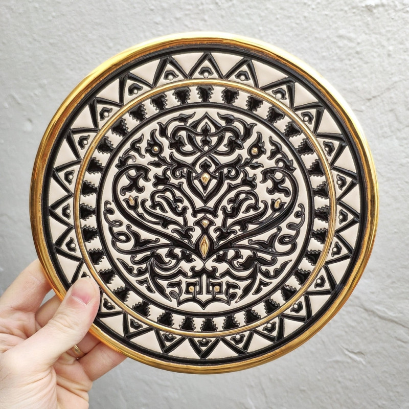 "Artecer" is the most prestigious of the manufacturers of these Seville ceramic plates. These plates are enamelled with 24-karat gold. It is known as the work of "dry rope", which was brought by the Arabs in the 8th century to Andalusia. Since then this craftsmanship has been carried out in Spain.