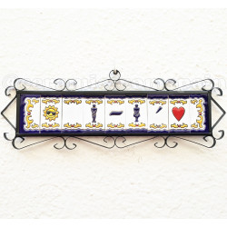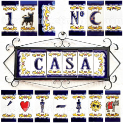 Signs with numbers and letters in polychrome ceramic tiles, hand-painted for making names, directions and signaling. Customizable text.