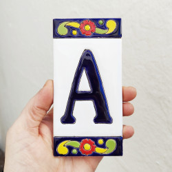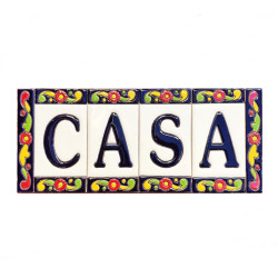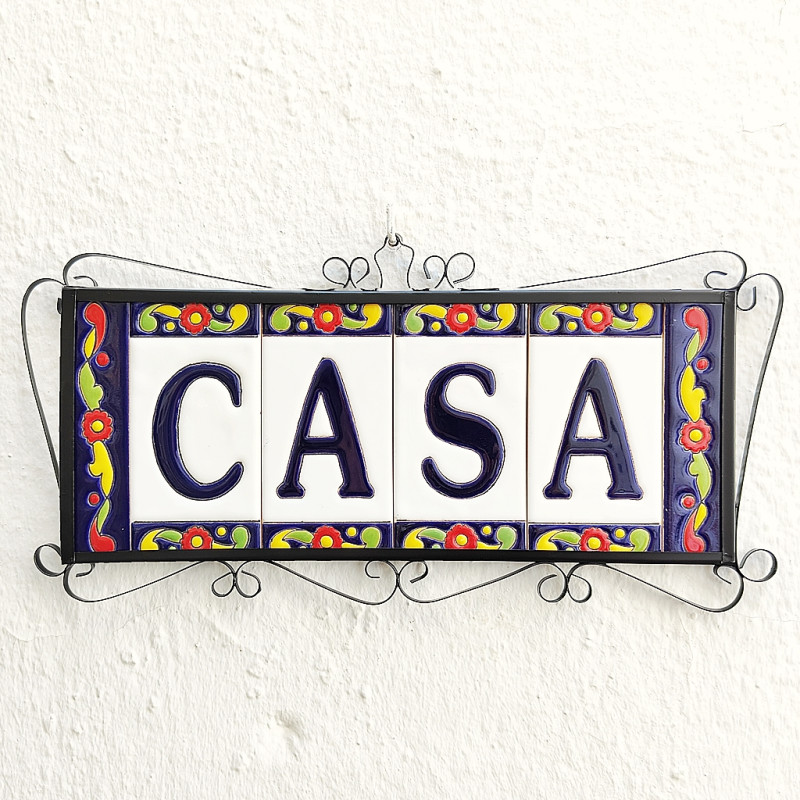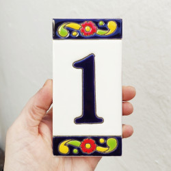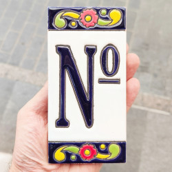 • Signs with numbers and letters on polychrome ceramic tiles, hand-painted using the cuerda seca technique for nameplates, addresses, and signage.
