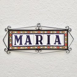 Signs with numbers and letters in polychrome ceramic tiles, hand-painted for making names, directions and signaling. Customizable text.