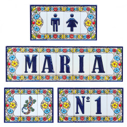 Signs with numbers and letters in polychrome ceramic tiles, hand-painted for making names, directions and signaling. Customizable text.