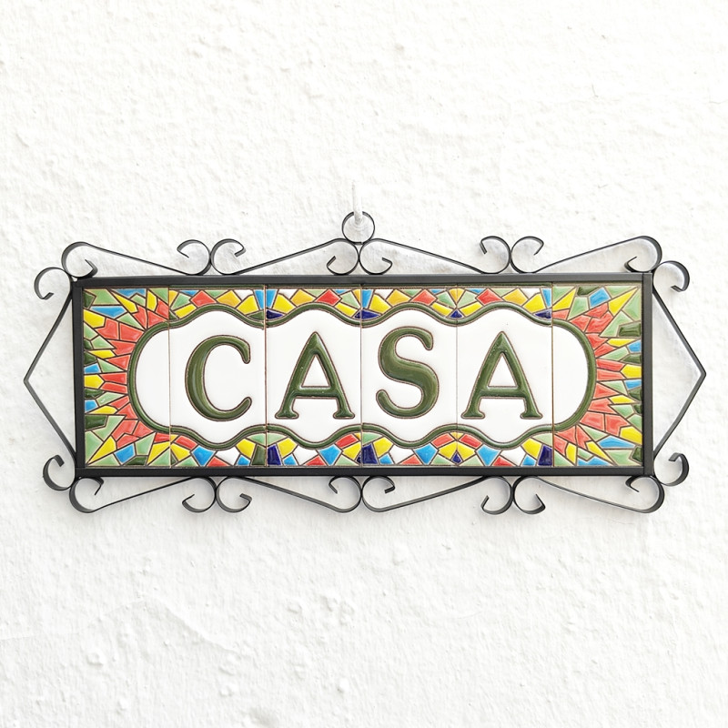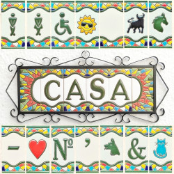 Signs with numbers and letters in polychrome ceramic tiles, hand-painted for making names, directions and signaling. Customizable text.